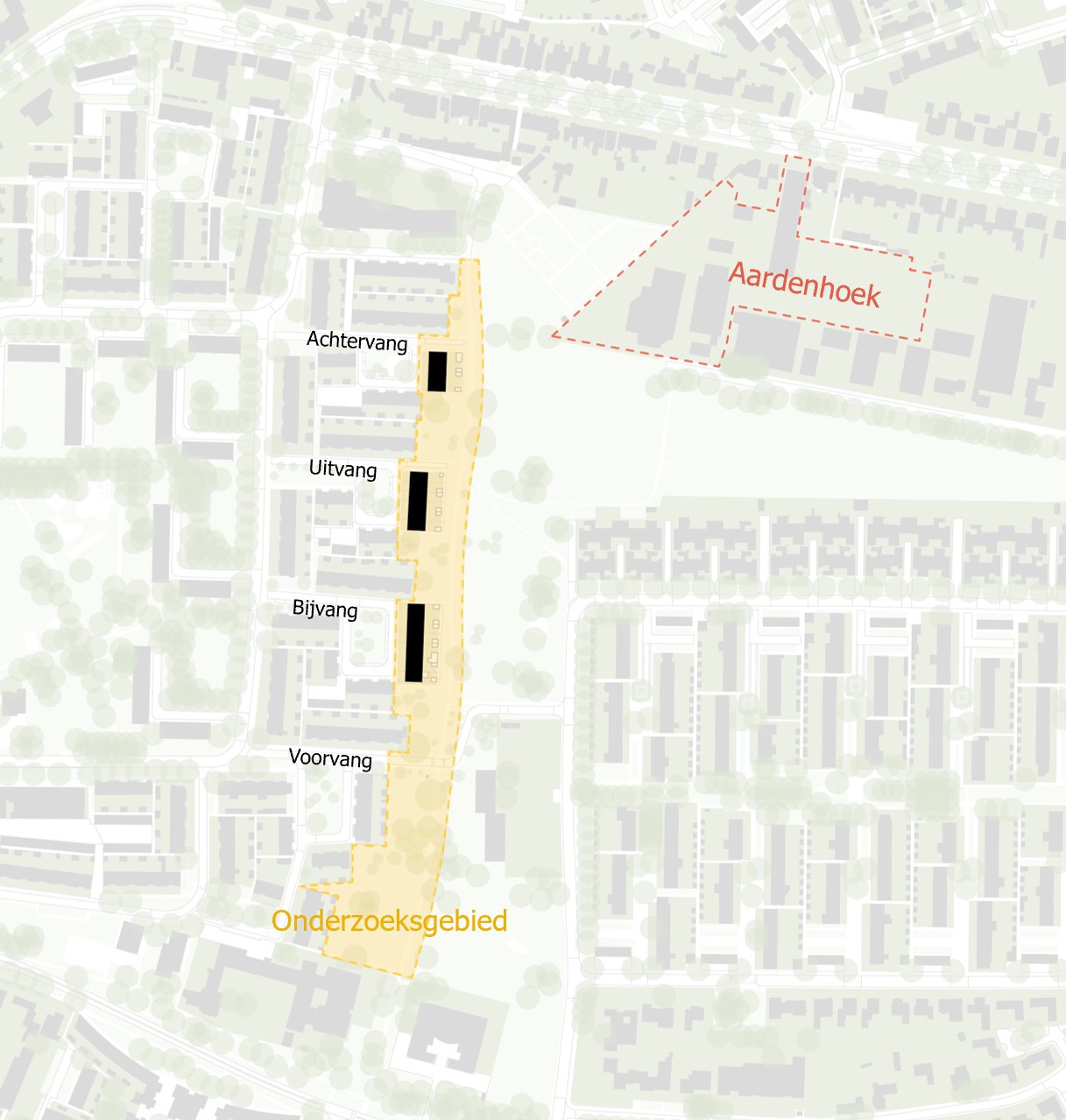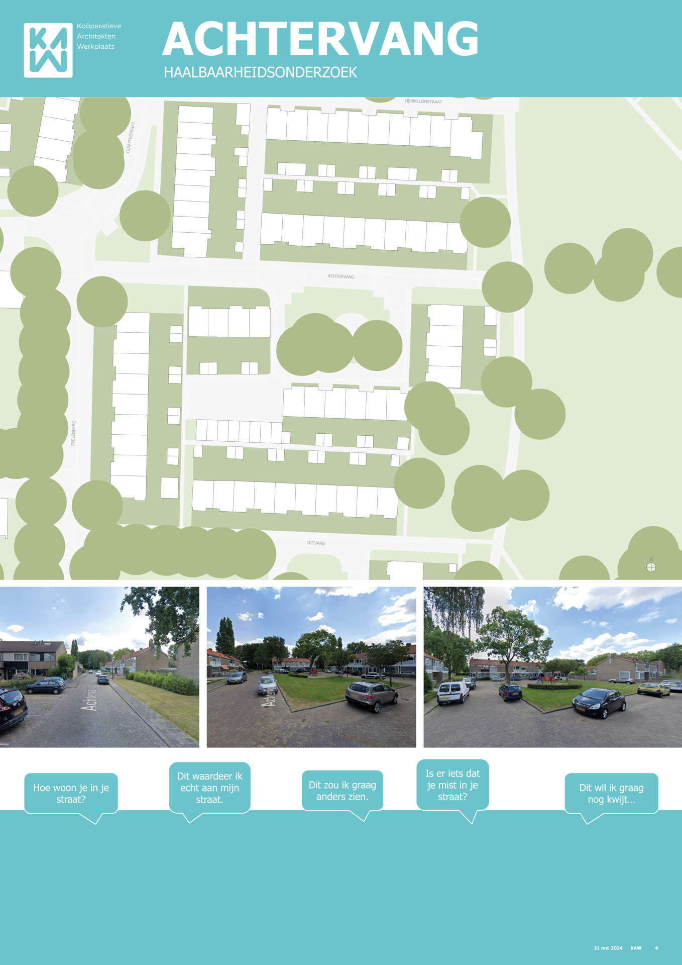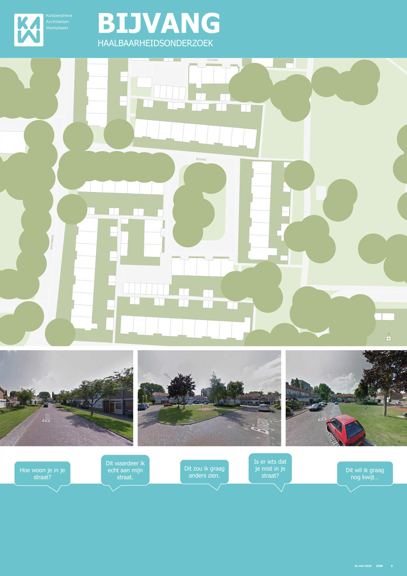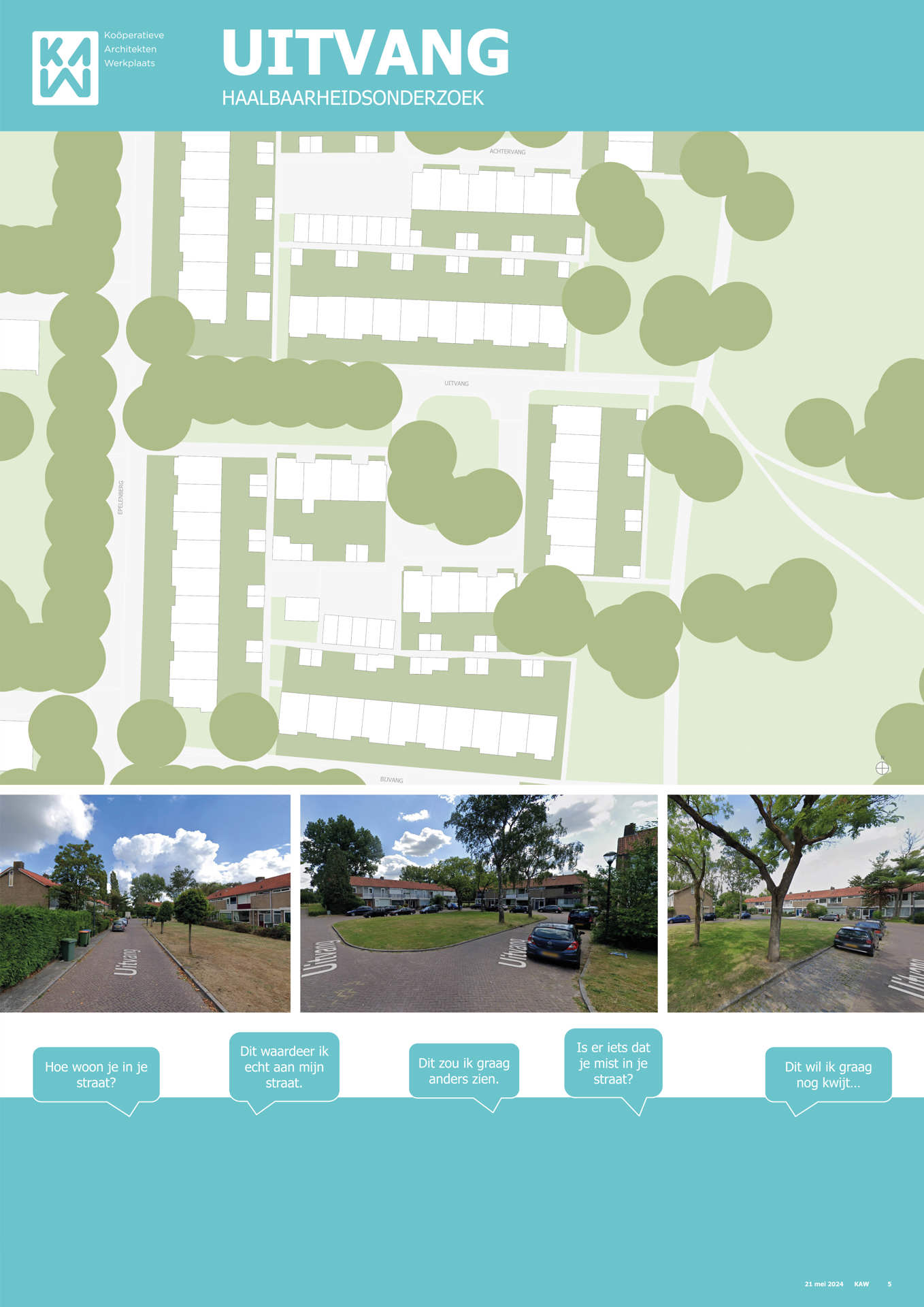 Samen met buurtbewoners, de gemeente, KAW architecten en Maas-Jacobs Vastgoed hebben we gesproken over de toekomst van de buurt: het gebied in en rondom de woningen aan de Achtervang, Uitvang, Bijvang en Voorvang in Breda. In 2024 vond hier een haalbaarheidsonderzoek plaats naar de mogelijkheden om gezinswoningen te vervangen door appartementen in verschillende prijsklassen, waarbij ook de kwaliteit van het gebied verbeterd kan worden. In het onderzoek is gekeken naar manieren om hitte en wateroverlast tegen te gaan en de groenstrook beter in te richten. Tevens kan de nieuwbouw een voorkant krijgen aan de groenzone tussen Brabantpark en Heusdenhout, waardoor de sociale controle in de groenzone verbetert.