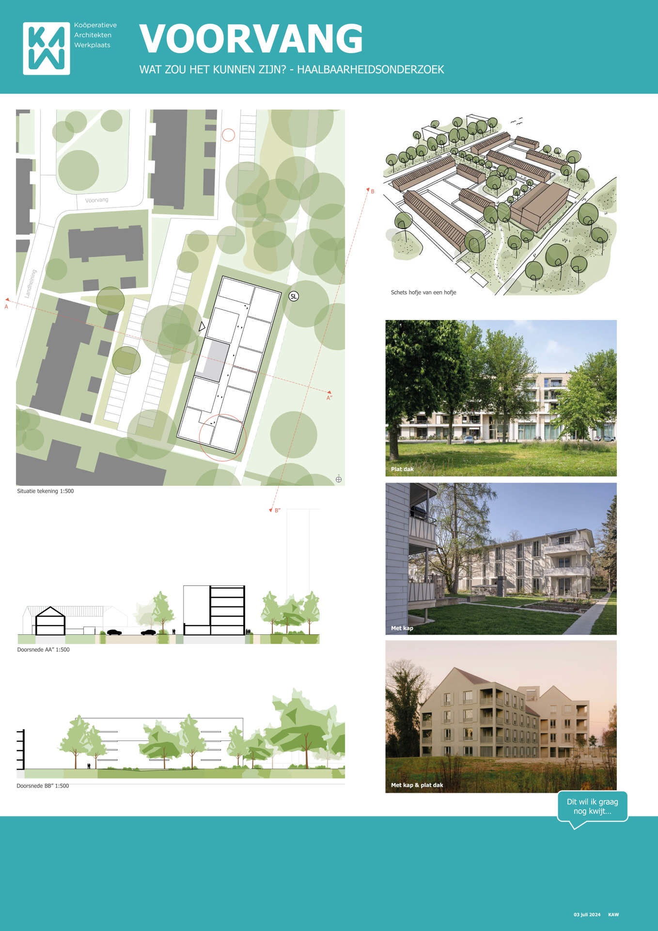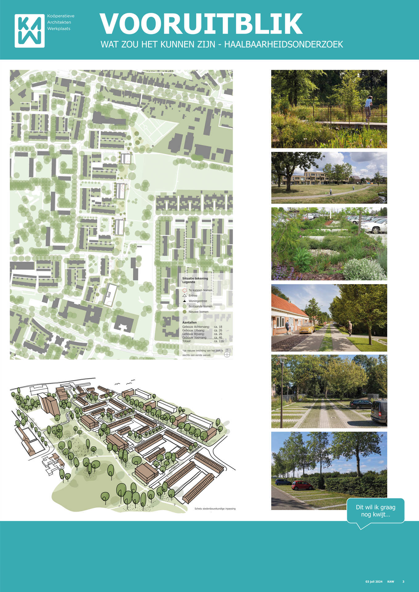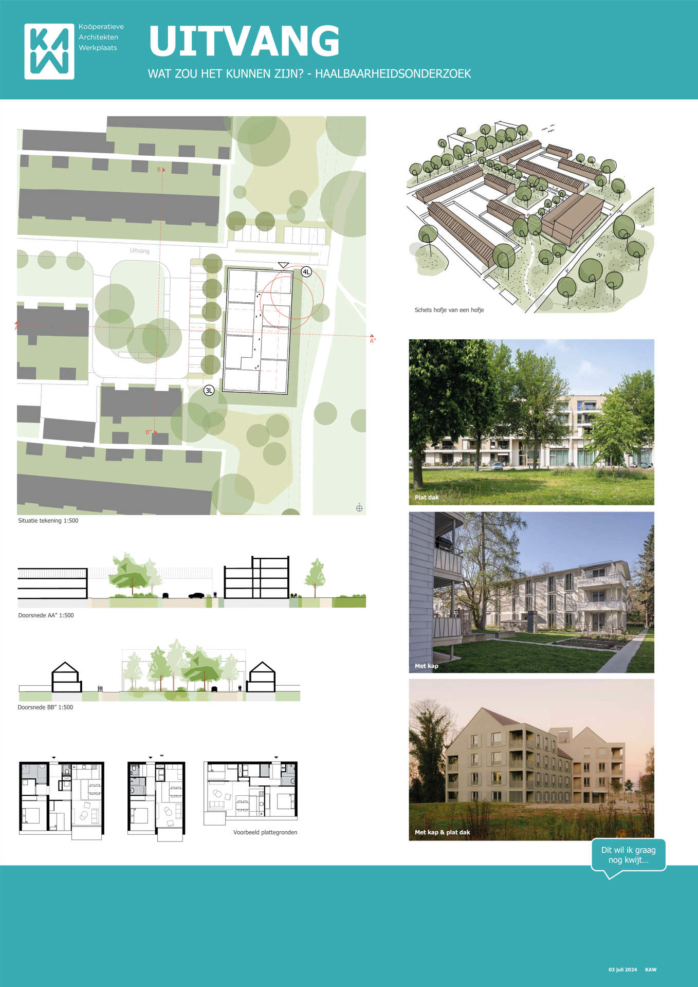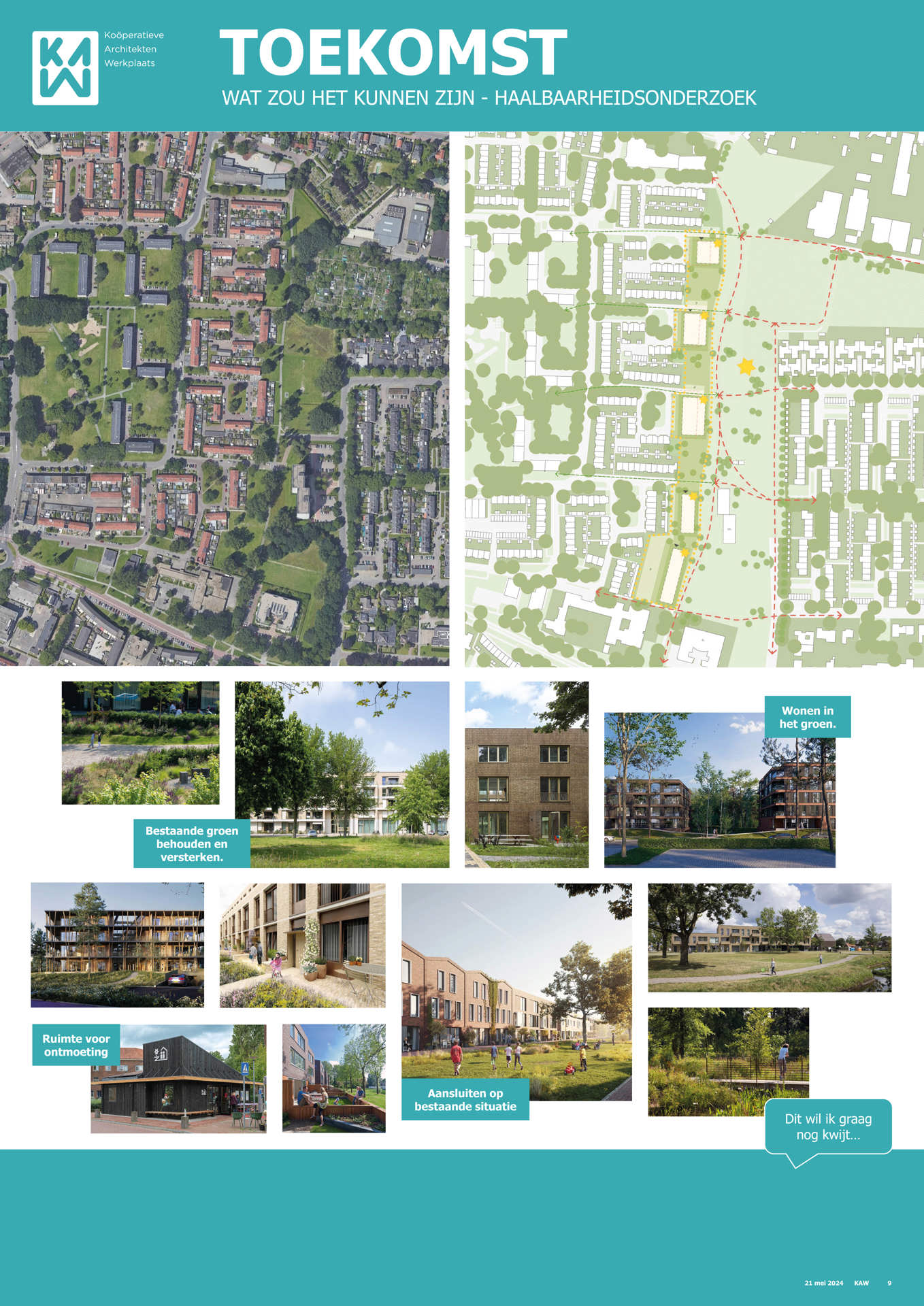 Samen met buurtbewoners, de gemeente, KAW architecten en Maas-Jacobs Vastgoed hebben we gesproken over de toekomst van de buurt: het gebied in en rondom de woningen aan de Achtervang, Uitvang, Bijvang en Voorvang in Breda. In 2024 vond hier een haalbaarheidsonderzoek plaats naar de mogelijkheden om gezinswoningen te vervangen door appartementen in verschillende prijsklassen, waarbij ook de kwaliteit van het gebied verbeterd kan worden. In het onderzoek is gekeken naar manieren om hitte en wateroverlast tegen te gaan en de groenstrook beter in te richten. Tevens kan de nieuwbouw een voorkant krijgen aan de groenzone tussen Brabantpark en Heusdenhout, waardoor de sociale controle in de groenzone verbetert.