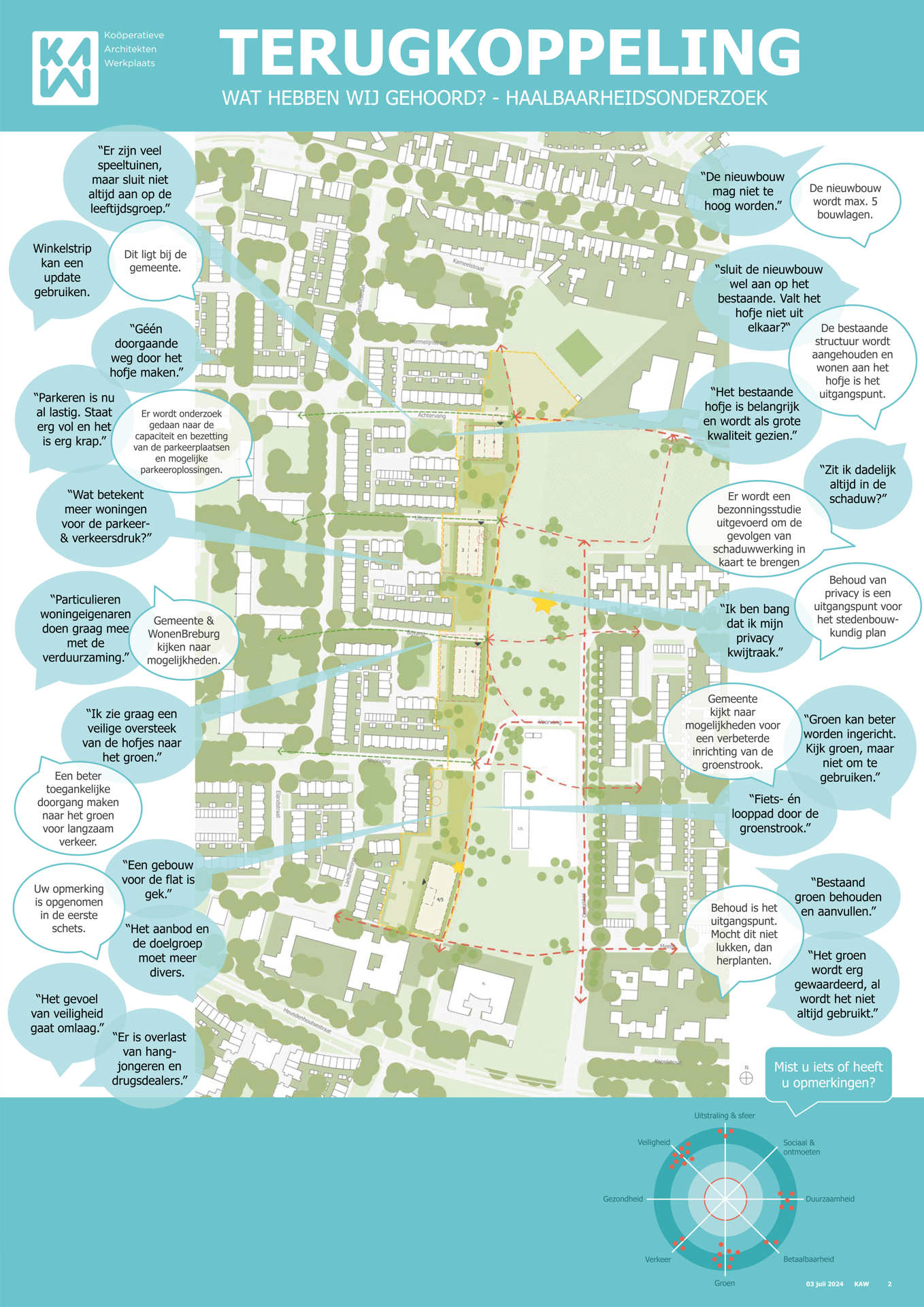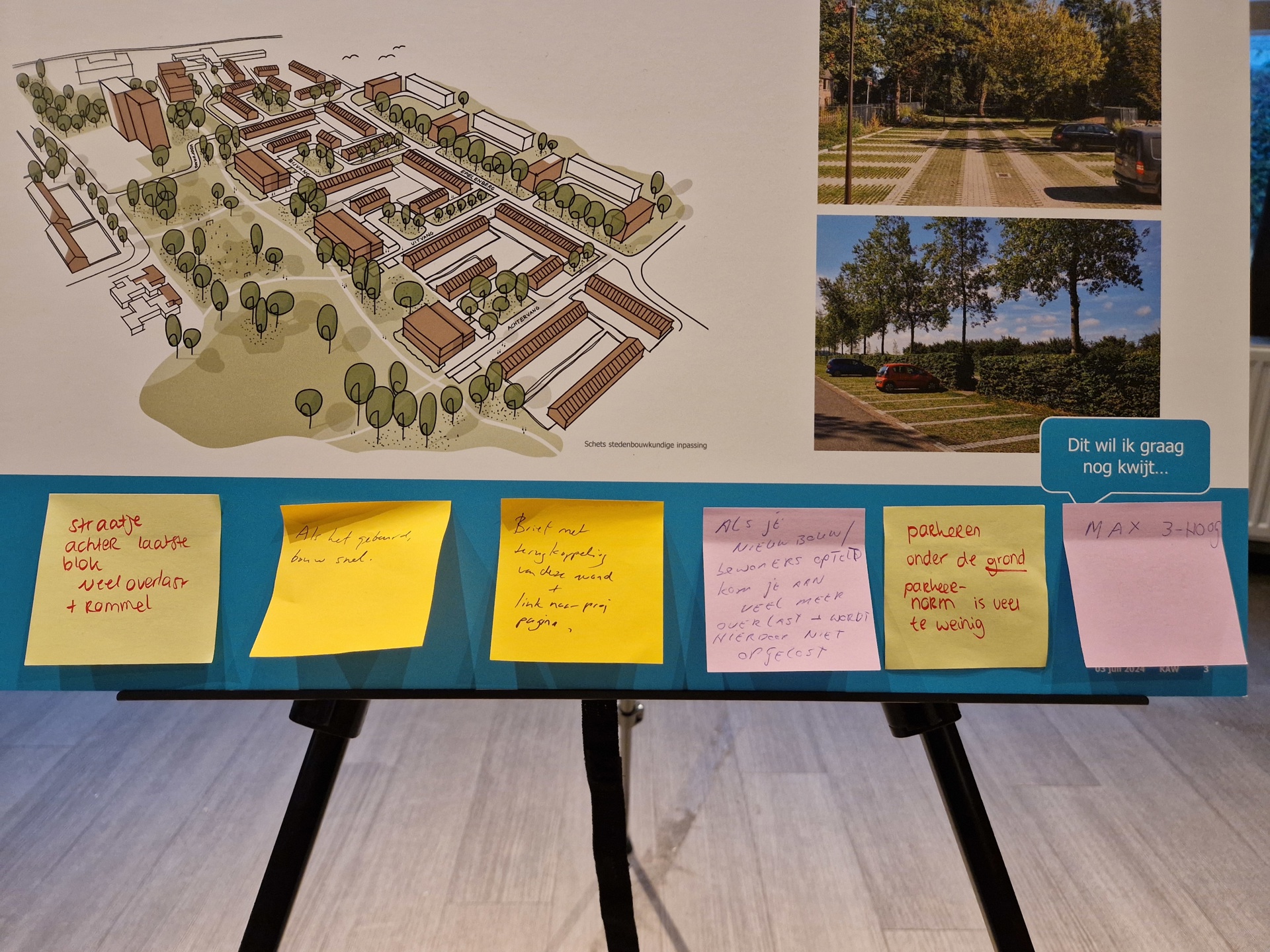Op 16 april 2024 hebben we eerst de bewoners geïnformeerd die in de woningen wonen waar we de bouw van nieuwe woningen onderzoeken. Tijdens informatiemarkten op 21 mei en op 3 juli 2024 hebben we met bewoners uit de rest van de omgeving gesproken over de mogelijkheden om de buurt te verbeteren en toekomstbestendig te maken. En wat daarin voor de bewoners belangrijk is. Samen is er gekeken naar de openbare ruimte, veiligheid, de leefbaarheid rondom de woningen, de parken en de groenstroken. Maar ook naar de mogelijkheden voor het toevoegen van verschillende soorten woningen en voorzieningen. Er is namelijk een groot tekort aan woningen en behoefte aan meer variatie in soorten woningen, met name gelijkvloerse woningen. Op 13 november is een concept stedenbouwkundig plan gepresenteerd aan de buurt.