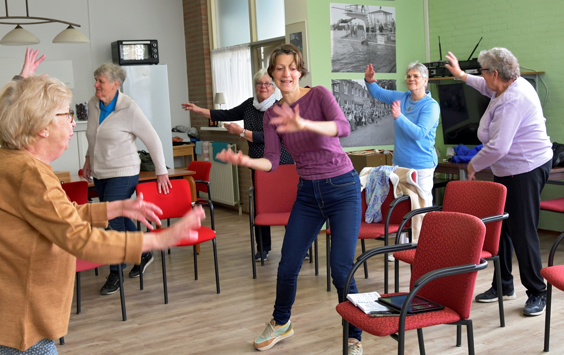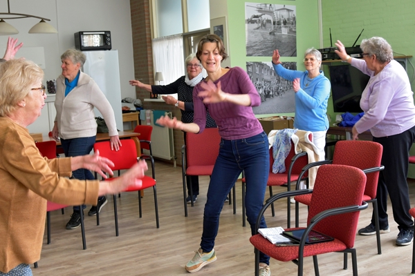 “Zijn er nog verzoekjes?”, vraagt Albertine aan de groep. “Ja! Die van de Beach Boys”, roept een dame. De deelnemers zijn tussen de 70 en 85 jaar oud, en iedereen beweegt op zijn eigen tempo en niveau. De een maakt de bewegingen heel groot, de ander doet het wat rustiger aan. “En dat is prima”, zegt Albertine. “Hier gaat het erom dat iedereen mee kan doen. Dat de deelnemers plezier hebben in het bewegen. Want dat is het allerbelangrijkste.”