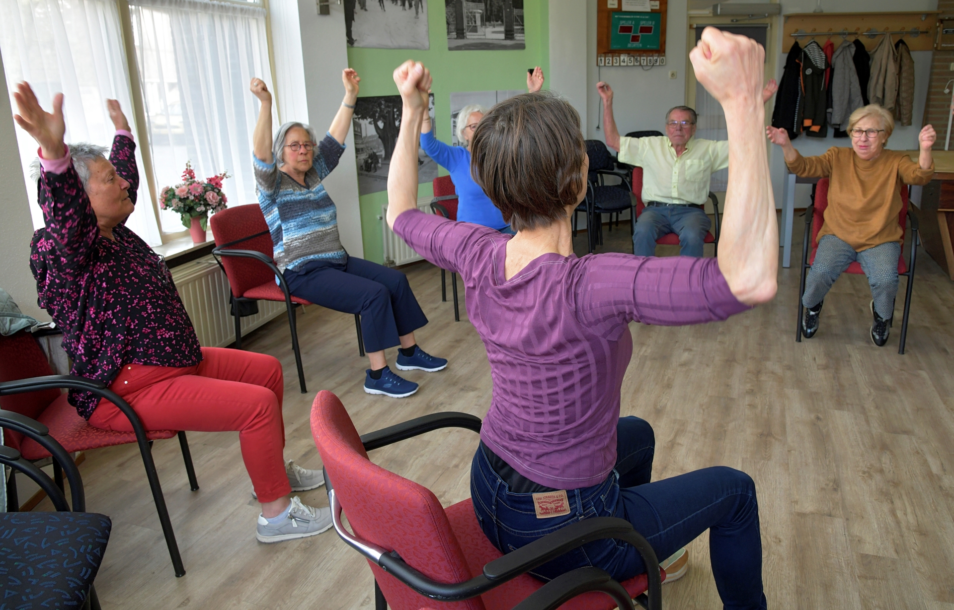 Het laatste nummertje speelt, terwijl de groep nog wat rustige afsluitoefeningen doet. Met de benen omhoog en omlaag. Met de armen van links naar rechts. En het hoofd op en neer. Dan zit het bewegingsuurtje erop en komt de koffie op tafel. “Met een kuukske erbij natuurlijk”, lacht een deelneemster.