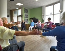 De muziek start en Ramses Shaffy klinkt. Op de woorden zing, vecht, huil, bid, doet Albertine een aantal bewegingen voor. De groep doet en zingt enthousiast mee. “Dit is niet alleen een fysieke oefening, maar ook goed voor de hersenen”, zegt Albertine. “Want er zit een vaste volgorde in de tekst en de bewegingen. En die passen dan heel mooi bij elkaar.”