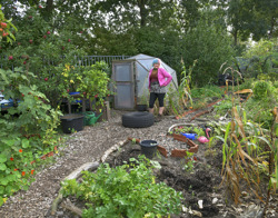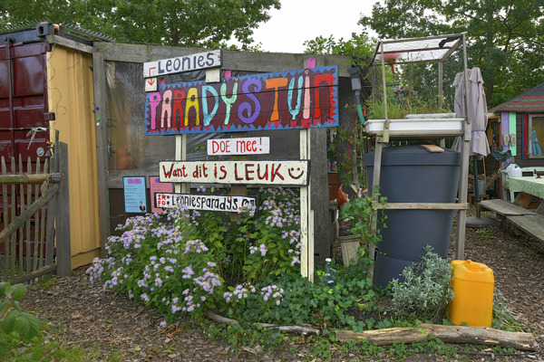 Kunstenares Leonie begon haar Paradijstuin zo’n vier jaar geleden. “Ik wilde een groene, duurzame ontmoetingsplek creëren waar ik mijn creativiteit helemaal in kwijt kon. Het begon met zand en daaromheen wat bamboestokken met afzetlint. Nu is het een kleurrijke plek waar prachtige bloemen staan, lekkere groenten groeien en waar iedereen van mee mag genieten.”