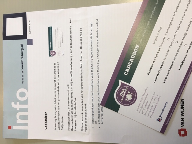 Vorige week kregen de bewoners van de eerste flat waar gestart wordt met de werkzaamheden, een cadeaubon van buurthuis ONS in de brievenbus. Aannemer Van Wijnen en WonenBreburg bieden de bon aan de bewoners om de verbouwherrie even te kunnen ontvluchten. Buurthuis ONS heeft daarbij nog een leuke actie bedacht: bewoners kunnen een 15 rittenkaart kopen waarmee ze ten tijde van het groot onderhoud warme maaltijden kunnen kopen.