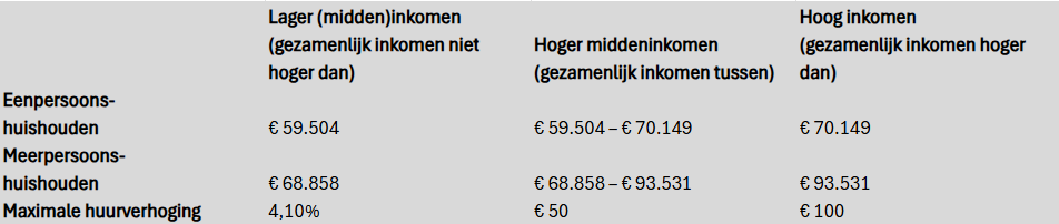 - De huurprijs stijgt met een hoger percentage dan volgens de wet mag. De richtlijn is dit jaar 4,1% voor sociale huurwoningen, 6,1% voor middenhuurwoningen en 4,4% voor vrije sector woningen.