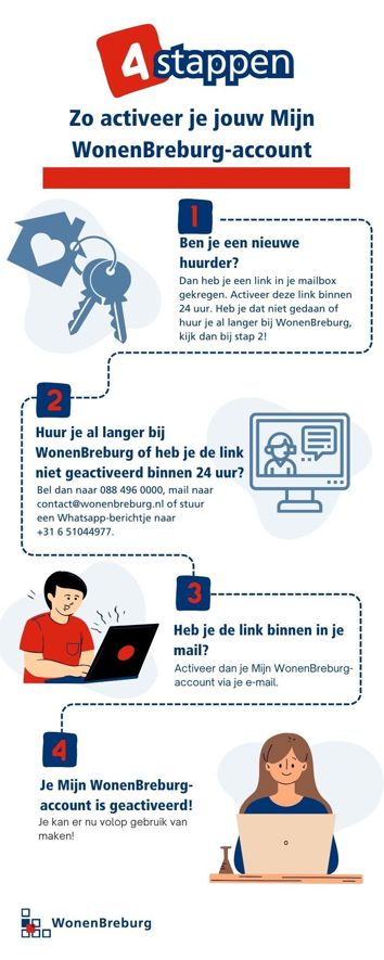 Huur je via WonenBreburg? Dan kun je inloggen om je persoonlijke gegevens in te zien, zoals je huurbedrag en contactgegevens. Bij het tekenen van je huurcontract heb je van ons een activatiecode ontvangen, waarmee je zelf een account kunt aanmaken. Je regelt je zaken eenvoudig online, op een tijdstip dat het jou uitkomt. Heb je nog geen account? Neem dan contact met ons op via 088-496 00 00, mail naar contact@wonenbreburg.nl of stuur een Whatsapp-berichtje naar 06 - 51 044977.