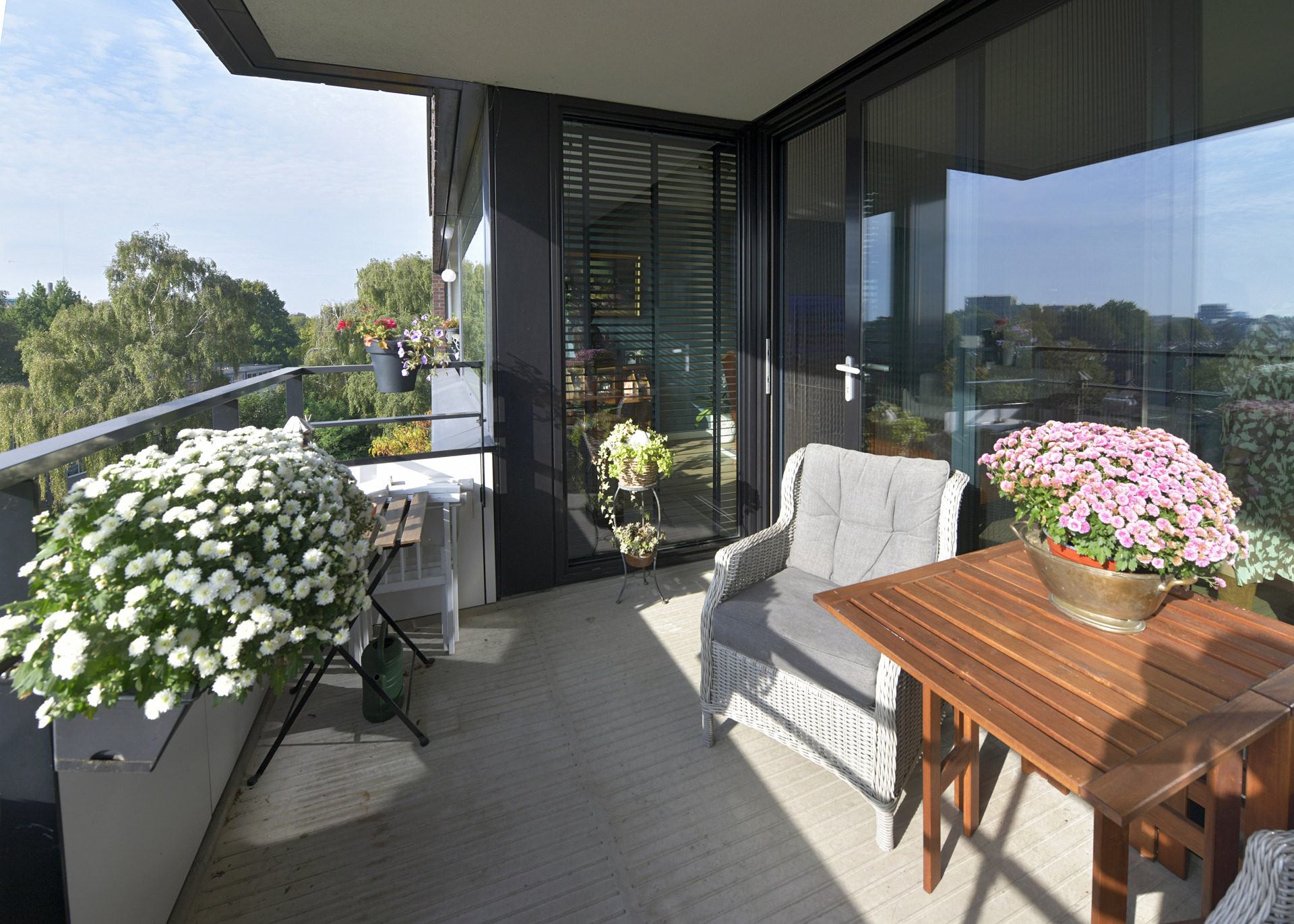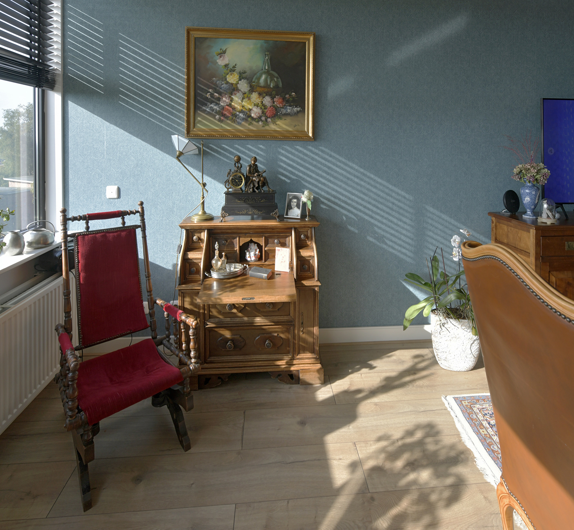 De woning ademt geschiedenis en bijzondere verhalen, met erfstukken die al generaties lang in de familie zijn. Zoals de sarong van Jimmy's oma, die een bijzondere plek heeft in de slaapkamer, of de Delftsblauwe vazen en viool aan de muur in de woonkamer. En op meerdere plekken in de woning vind je schilderijen, geschilderd door oom Rinus. Vanaf het balkon op vier hoog kijk je uit over de skyline van Breda met de Grote Kerk, de Koepelgevangenis en het reuzenrad bij het Breepark. “Toen we deze woning voor het eerst bezochten, werden we meteen verliefd op het uitzicht”, vertelt Mientje. “Met en balkon op het zuiden is het hier heerlijk in de zomer. En we hebben een prachtig uitzicht op het vuurwerk met oud en nieuw. Eerlijk gezegd willen we hier niet meer weg.”